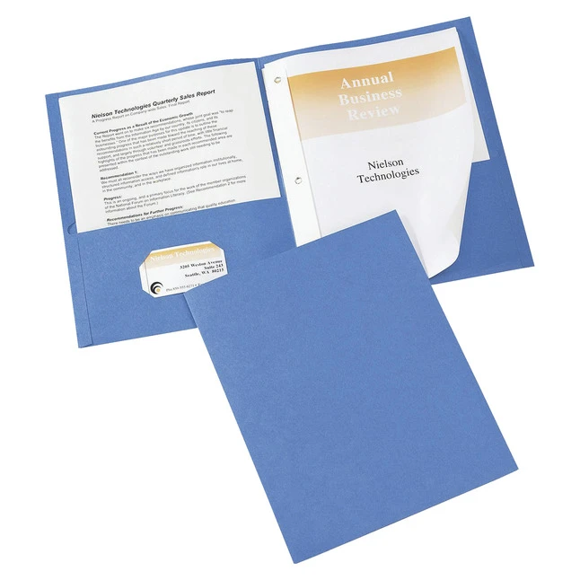 Two-pocket folders feature three durable fasteners that hold up to 20 three-hole punched, letter-size pages for professional reports. Two interior pockets accommodate loose papers, allowing you to stow notes, brochures or other unpunched pages along with the report. Left pocket has a die-cut, business card holder. Each report cover is constructed of sturdy embossed paper for a classic look.