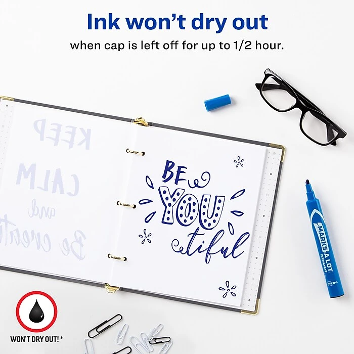 Bring bright color to packages and labels with these Avery Marks-A-Lot permanent markers. The quick-drying, rub-resistant ink resists smudges and smears to keep writing neat and legible, while the chisel tips let you create broad strokes or fine lines. Rounded barrels deliver a comfortable grip while writing, so you can tackle stacks of labeling tasks effortlessly. Featuring a nontoxic formula, these Avery Marks-A-Lot permanent markers make an excellent option for teachers and students.