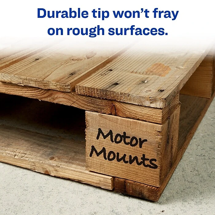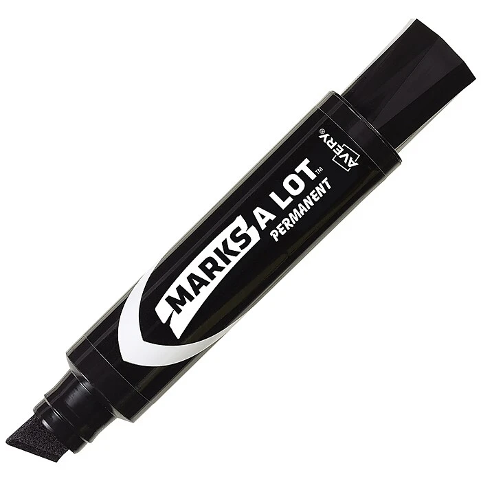 Create lines of varying widths with a single pen by using these Avery Marks-A-Lot chisel-tip black permanent markers. The nontoxic low-odor ink is safe for adults and children, while the giant ink supply ensures each marker lasts for a long time. These Avery Marks-A-Lot chisel-tip black permanent markers can write on nearly any hard surface, and the ink resists fading and smudging.
