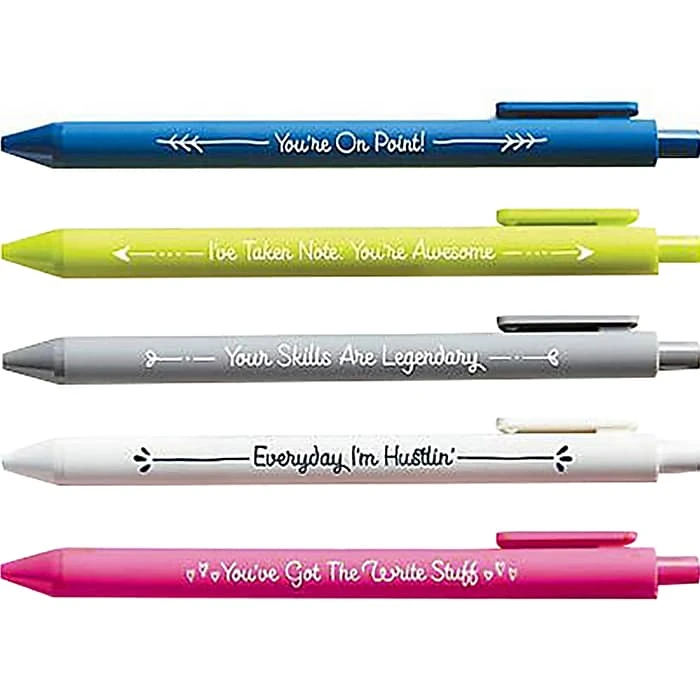 With soft-touch grips, gel tips, and witty recognition sayings, these Baudville Thankful Appreciation pens will be everyone’s new favorite, whether they’re signing official documents or doodling away in their notebook. Five pens per pack.