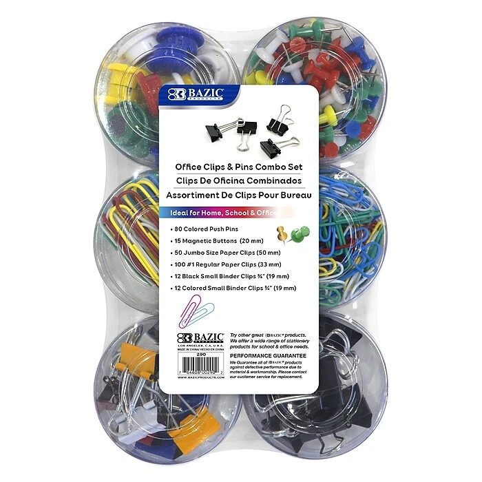 Bind your work together with our wide assortment of office clips, pins, and rings. Each set includes 269 pieces: 80 color push pins, 15 magnetic buttons (20mm), 50 jumbo size paper clips (50mm), 100 #1 regular size paper clips (33mm), 12 small black binder clips 3/4″ (19mm), and 12 small colored binder clips 3/4″ (19mm). Sold as 3 sets for a total of 807 pieces.