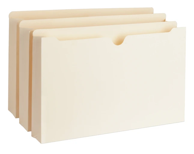 File jacket features full-height side gussets to keep materials from slipping out. Great for carrying files out of the office. Select reinforced tabs are designed for frequent use. Thumb-cut provides easy access. Top corners are rounded. Heavyweight, one-piece construction has two-ply straight-cut top that is 1/2 inch high. File pocket is made of 11 point stock.