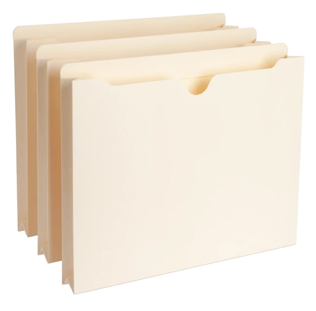 File jacket features full-height side gussets to keep materials from slipping out. Great for carrying files out of the office. Select reinforced tabs are designed for frequent use. Thumb-cut provides easy access. Top corners are rounded. Heavyweight, one-piece construction has two-ply straight-cut top that is 1/2 inch high. File pocket is made of 11 point stock.