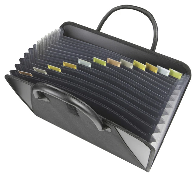 Expanding file with handles looks like a briefcase and organizes like an expanding file. Design features 13 pockets with 12 dividers and color-coded index tabs. The clear pockets expand to hold important letters and documents. Hook-and-loop closure keeps materials safe and secure. Great for meeting and event planning. Expanding file has a soft-sided fabric finish and holds up to 300 letter-size documents.