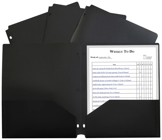 With the help of this two-pocket folder, your letter-size papers can stay organized while still remaining accessible in your three-ring binder. Heavyweight polypropylene material resists tearing for long-lasting organization. Cutouts at the top and bottom keep it from being caught in your binder’s open-close mechanism. Pre-punched edge allows easy organization in your three-ring binder. Pack of 25.