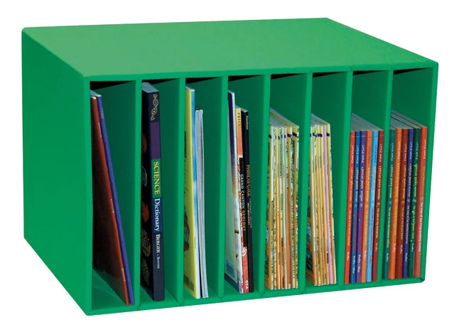 Classroom Keepers Literature Center in green measures 12-1/4 x 17-3/8 x 11-1/4 inches and features glossy finish for attractive appearance. It is perfect for organizing books, DVDs, magazines. Books can be organized based on targeted reading levels, subjects, themes or author. Organizer is made of sturdy corrugated cardboard and is easy to assemble.