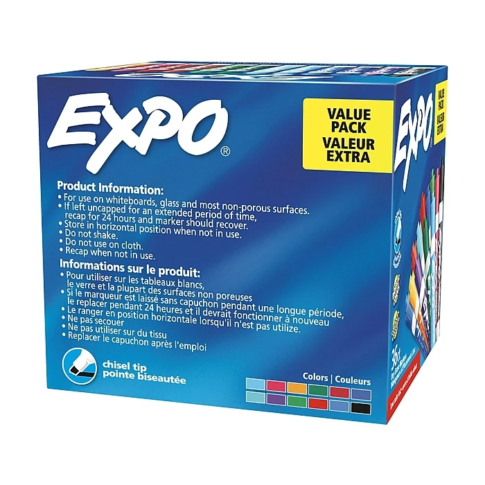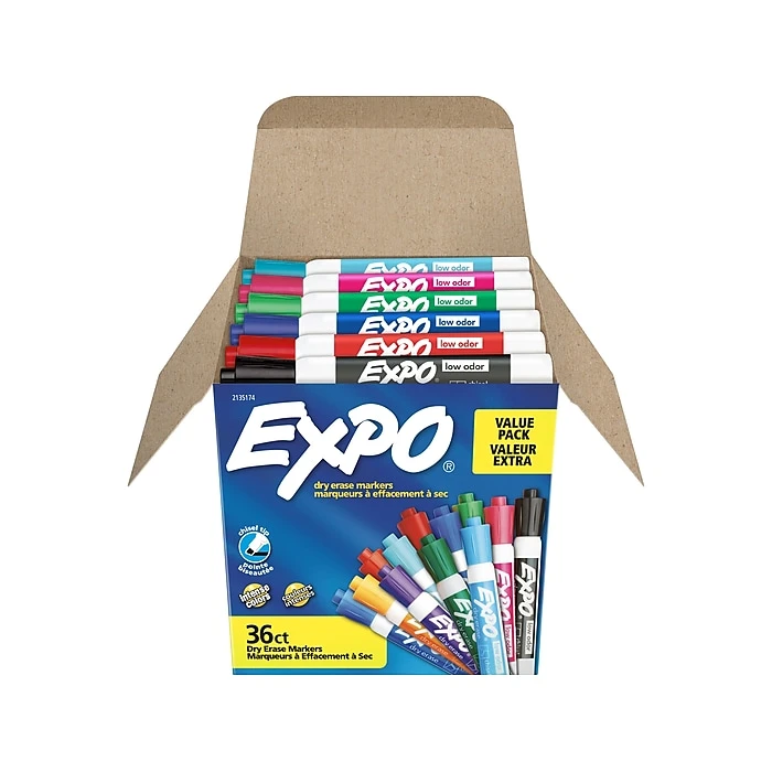Expo low-odor chisel dry-erase markers offer the perfect solution for marking on whiteboards and most nonporous surfaces. These dry-erase markers use a specially formulated, alcohol-based ink with virtually no odor. They feature vivid, quick-drying ink that is easy to see from a distance. The ink erases cleanly and easily from whiteboards and most nonporous surfaces with a dry cloth or eraser. The chisel tip creates broad, medium, or fine lines. Use your Expo dry-erase markers to track, schedule, and present.