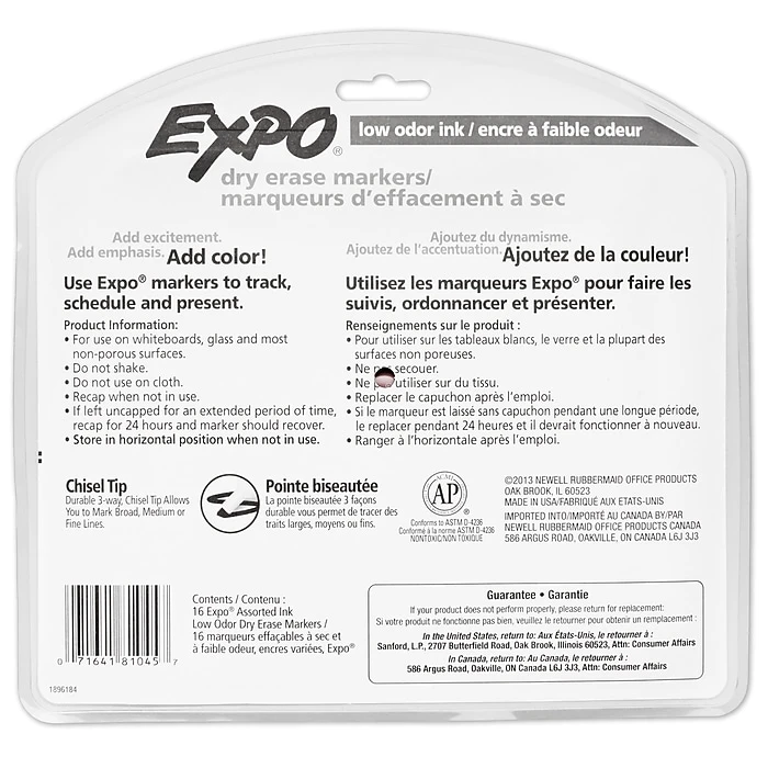 Expo Low Oder Dry Erase Markers, Chisel Tip, Assorted Inks, 16/Pack (81045)