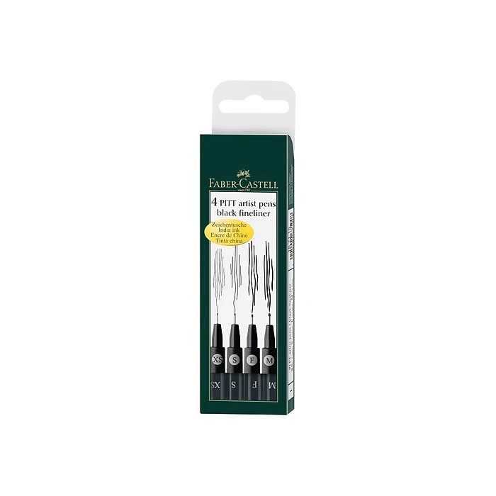 Learn how to draw with ink using these artist pens. The acid-free pigmented India ink produces odorless marks that don’t bleed through paper, withstand water damage without smearing and resist fading over time. These Faber-Castell Pitt black artist pens have polypropylene caps and shafts that keep ink from drying out and boast four different tip widths for producing lines of varying thickness.