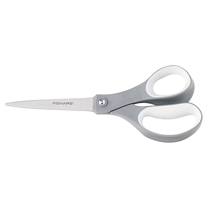 Fiskars 8″ Soft grip scissor has a unique design that features a cushioned grip for reduced hand fatigue and hardened. Scissor is used to cut papers, boxes or more and has pointed type tip with straight handle orientation.