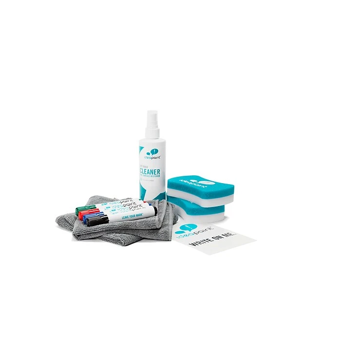 Start up your IdeaPaint walls with the supplies you need to get going. Start up set includes: 4-Pack Bullet Tip Multi-Color Dry Erase Markers, 2 Original Foam Erasers, 2 Cleaning Cloths, 1 Cleaner Spray, 8 oz. and 1 Wall Decal (which signifies that a wall can be written on).