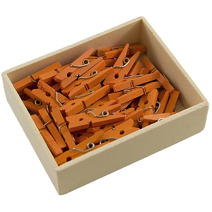JAM Paper® Small Orange Wood Clothing Pin Clips are sold in wooden boxes of 50! Each pin measures 7/8 of an inch and is made of wood with a metal spring mechanism. These clothing style pins are painted with a pumpkin orange shade of paint. Versatile and lightweight, these pins are great for fastening photos, memos, receipts, cash, note cards, place cards, and other small items to surfaces or string. Providing a light amount of pressure, there clips and be easily removed and reattached. Use these pins in your home or office! They are ideal for many crafts, organization projects, decorations, attached notes to party favors, and much more!