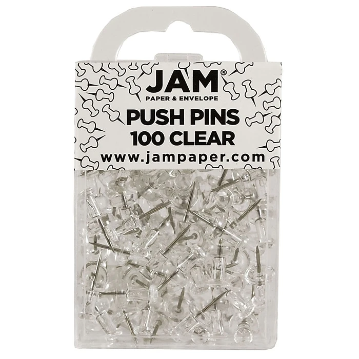 High Quality Pin Assortment/strongbra/When you want your work to stand out, instead of what’s holding it up, JAM Paper® White Push Pins are perfect for you. Let your artwork speak for itself without any distraction. With these push pins, made from sharp metal and durable plastic, you’ll be able to hang anything from tapestries to picture frames. White Push Pins are sleek and efficient. Each one is able to withstand much more weight than it looks like these little guys can handle. Redecorating at home? These push pins can hold up just about any decoration you throw their way. Each box contains 100 Pins, perfect for all of your hanging needs around the house, at the office, or the classroom./pDetails/strongbra / Color: Clearbra / Quantity: 200 Push Pins/p
