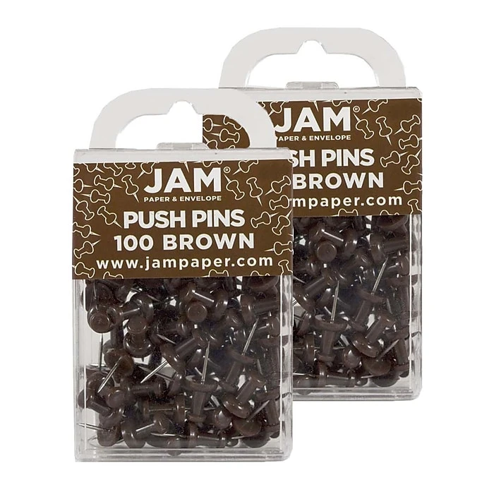 Throw those boring old Push Pins to the side and make way for new and exciting colorful Push Pins! JAM Paper® Brown Push Pins are a classy and fun alternative to the standard clear Push Pin. Anything worth posting should be done in style, even office memos. Add some style to your board and work day with these tiny heroes. These little guys are the perfect way to add some flare around the house, classroom, or at the office. Made from sharp metal and durable plastic you’ll be able to hang anything from tapestries to picture frames. Never settle for boring Push Pins again.