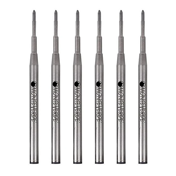 Monteverde® Soft roll⢠Ballpoint refill in black for Montblanc® pens has low viscosity ink for easy flow in large capacity metal body for long writing. Refill bears a nickel plated brass tube and a medium point swiss tip, sold as 6 per pack.