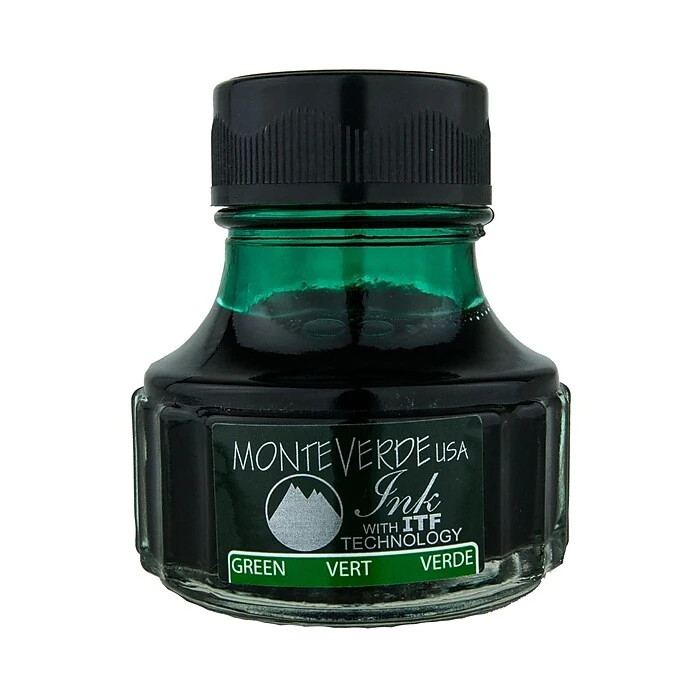 Monteverde® Green fountain pen ink bottle features improved ink drying time. An extended cap off time leads to lubrication and protection of the system to make it corrosion and clog free.
