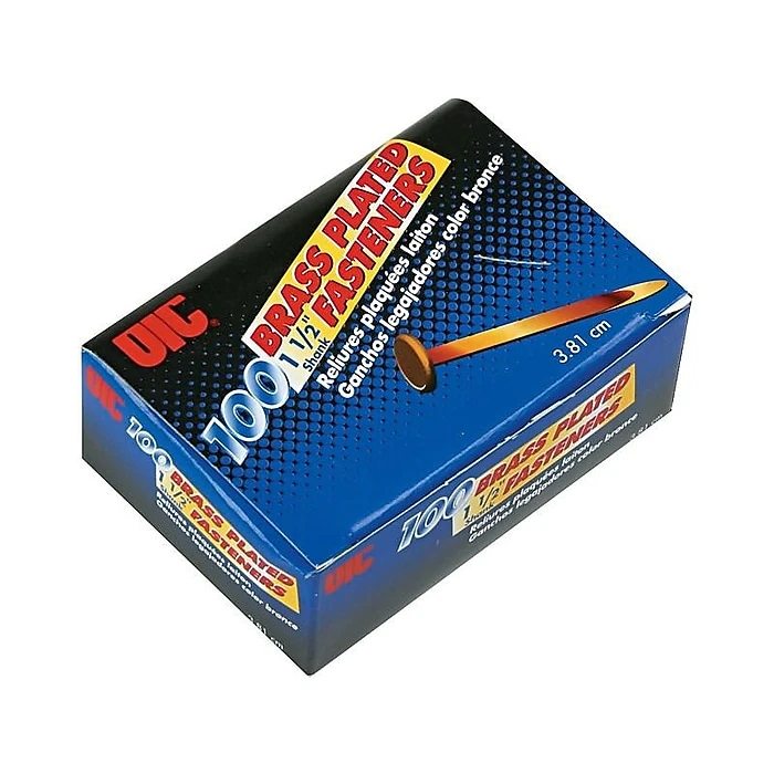 Keep documents contained and organized with these gold round-head fasteners. Each fastener is made with brass-plating over a sturdy steel frame and has a sharp tip for easy insertion, while the flexible, durable body lets you fasten them at odd angles. These Officemate round-head fasteners come in a pack of 100, have a 1.5-inch capacity, and can secure documents on numerous surfaces.