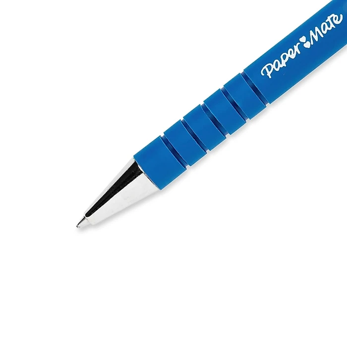 The refillable blue Paper Mate FlexGrip Ultra Recycled Retractable Ballpoint Pen comes in packs of a dozen and features the Lubriglide ink system for smooth writing. This 0.8 mm fine point ballpoint pen has a conical steel tip flange that delivers extra durability. Paper Mate pens have pocket clips and rubberized black grips with blue accents.