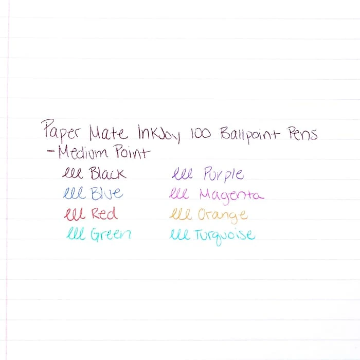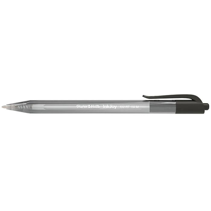 Paper Mate InkJoy 100RT retractable medium-point black ballpoint pens spread ink easily, so you can keep taking notes late into the day. The retractable design helps prevent messes on clothing and office furniture.