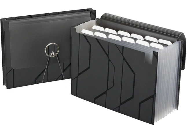 Pendaflex Sliding Cover Expanding File features a sliding Black cover that keeps the flap out of the way when accessing documents. Expanding bottom allows additional capacity as well as the ability to stand on a desktop. Use elastic closure to secure the file and protect documents on-the-go. Expanding file is made of super durable poly and includes self-adhesive blank labels. Has 13 pockets and measures 9-3/8 x 1-1/8 x 13 inches.