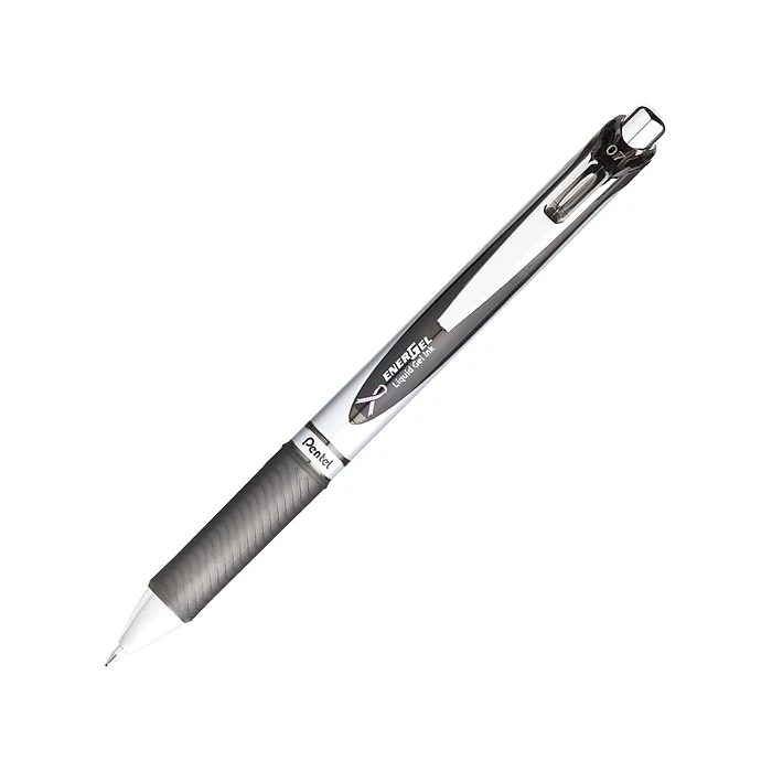 Support breast cancer research with these medium-point retractable Pink Ribbon black-barrel gel-ink pens. The sleek design and silver accents provide a stylish appearance, while the cushy grip offers a comfortable writing experience. These Pentel EnerGel Deluxe retractable Pink Ribbon gel-ink pens feature medium points for producing sharp lines while maintaining accuracy, and they come in a 3-pack so you always have a backup.