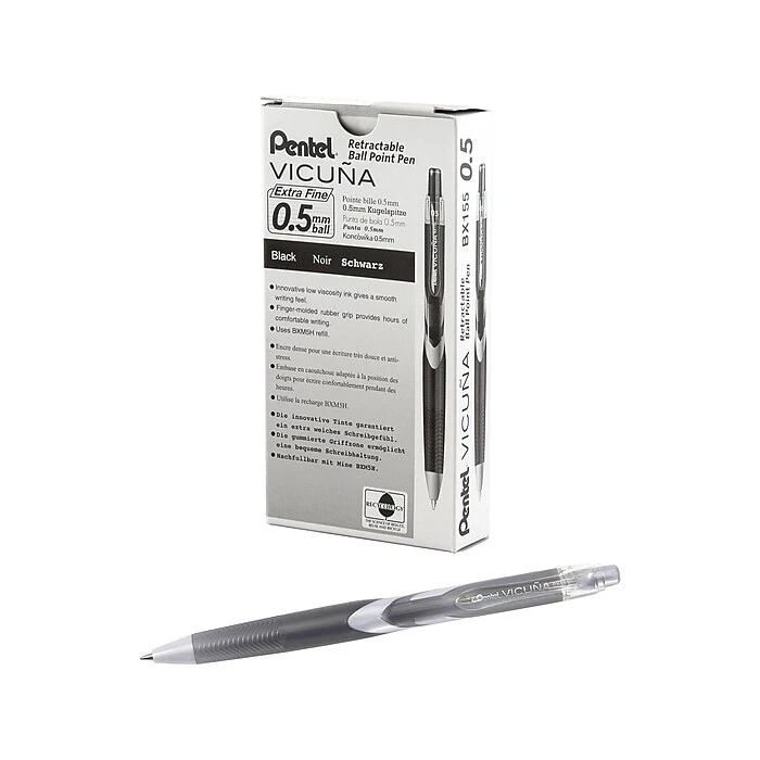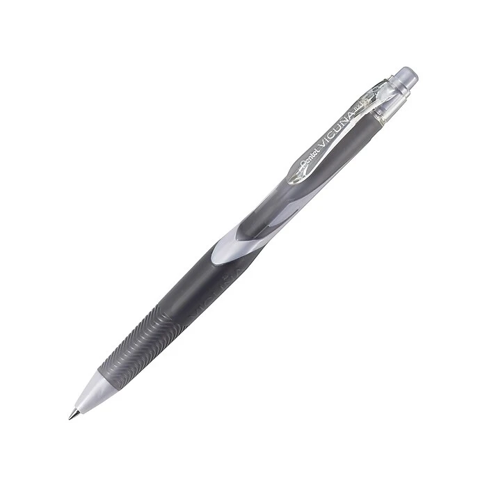 Write with ultra-smooth ink using these Pentel VICUÑA retractable ballpoint pens. Each pen features a stress-free finger-molded grip to take the strain off your fingers, while the barrel is made of 66 percent recycled material, making these pens an ideal choice for the environmentally conscious user. These Pentel VICUÑA retractable ballpoint pens each use a 0.5mm point for producing extra-fine lines.