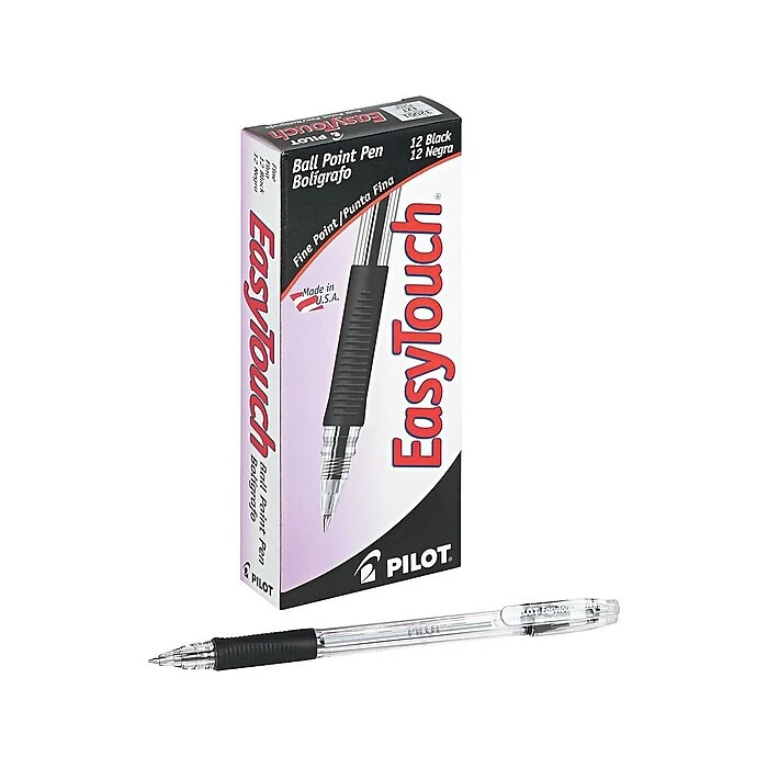 Experience clean, smooth writing by using these fine-point pens. With a rubber grip, these pens provide increased comfort for lengthy writing projects, and the transparent barrel lets you easily monitor the ink supply, preventing you from running out without warning. These Pilot EasyTouch black ballpoint pens have a 0.7mm tip, producing precise, accurate lines.