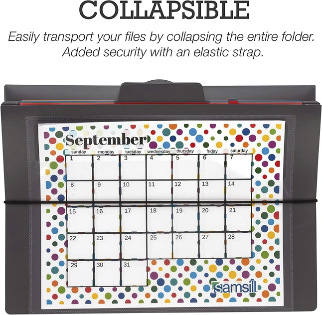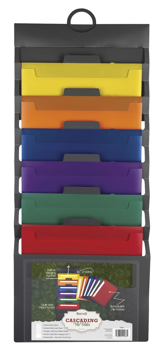 This customizable hanging file organizer is perfect for on the go. It is collapsible with an outer elastic band to ensure everything stays in place. Features a built-in handle for hanging and a customizable front cover, which is perfect for a monthly calendar or school papers. Each individual folder is removable, making it easy to take one subject out when needed.