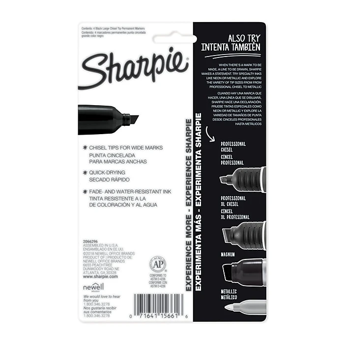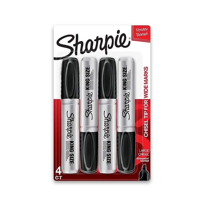 Express yourself permanently with chisel tip markers that make broad, medium and fine strokes. In the classroom, office, or home you can apply permanent markings to paper, wood, metal, plastic and most other materials. These Sharpie Pro King Size markers feature resilient ink that is waterproof, fadeproof and dries quickly to eliminate smudging and provides vibrant impressions for a long time to come.