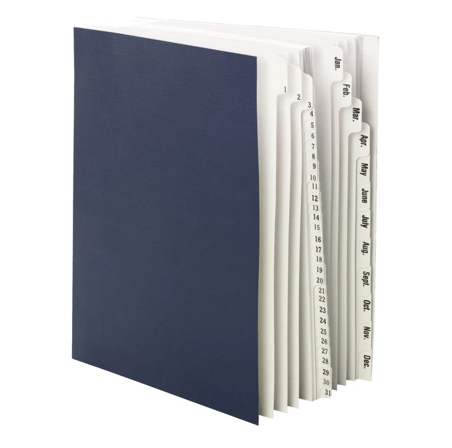 Desk File/Sorter measuring 9-7/8 x 11-3/4 inches has tabs on 43 dividers that are labeled from 1 to 31 and January – December for monthly and daily filing while DuPont Mylar reinforced index tabs are printed on both sides for easy sorting. Sorter has heavyweight dividers that are bound book-style offering to open the desired section and consists holes in the center of divider to see if section contains paper. It has 10% post-consumer materials and extra-tough cover swab clean with a damp cloth.