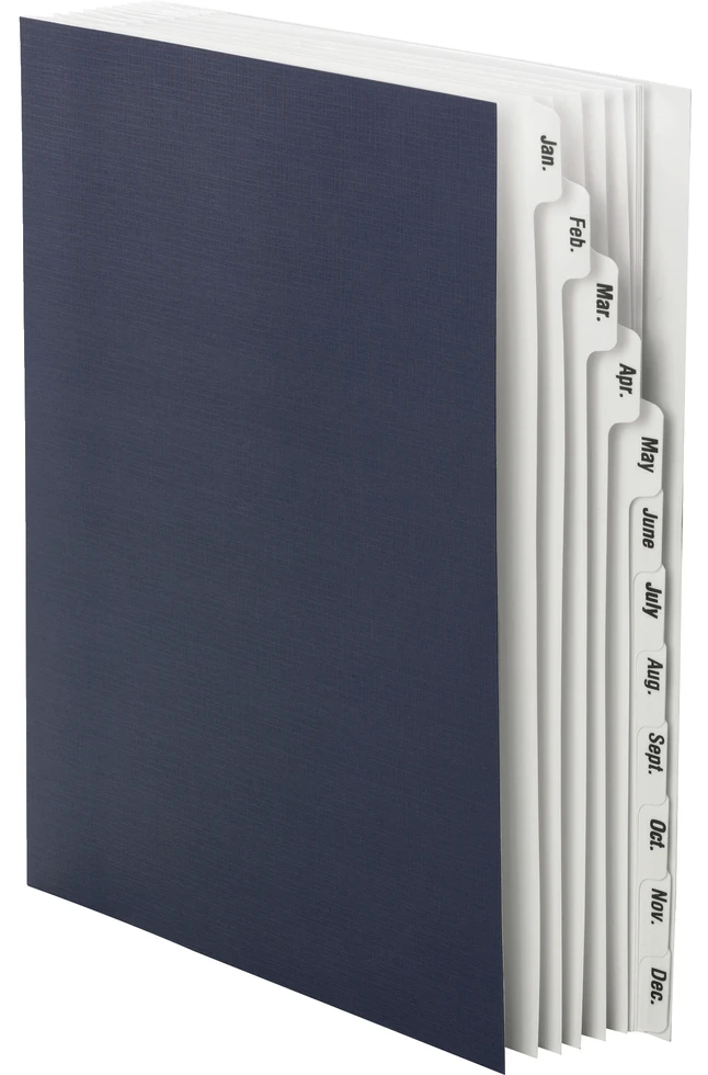 Desk File/Sorter is ideal for organizing loose paperwork neatly. Heavyweight dividers are bound book-style so it’s easy to open to the desired section. Divider tabs are printed in black and poly reinforced for frequent use. Monthly indexed files let you organize papers by the date follow-up action needs to be taken. Holes in the dividers help to locate papers remaining in file. Each section of this Monthly Desk File/Sorter expands to 1-3/8 inches. Accordion fold is tape-reinforced for durability. Premium linen cover has a non-soiling, extra-tough finish.