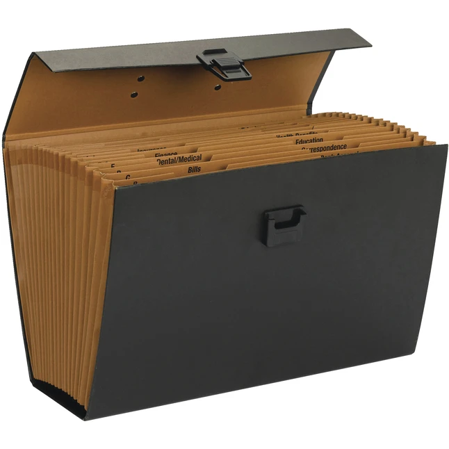 Expanding file box helps you stay organized in your office or on the road. 19 pockets in the file hold more than 1,400 sheets of both letter-size and legal-size paper. Design features a handle and latch closure for secure transport. File box includes printed tabs with subject headings and alphabetic indexing from A to Z.