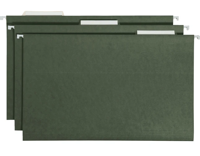 A popular choice for desk drawer files, hanging folders keep important papers neat and organized. Coated rod tips allow smooth glide. Clear vinyl 1/3-cut tabs with blank inserts can be positioned in a variety of locations. Two-tone green stock prevents filing papers between folders.