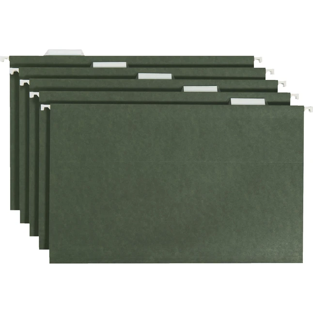 A popular choice for desk drawer files, hanging folders keep important papers neat and organized. Coated rod tips allow smooth glide. Clear vinyl 1/5-cut tabs with blank inserts can be positioned in a variety of locations. Two-tone green stock prevents filing papers between folders.