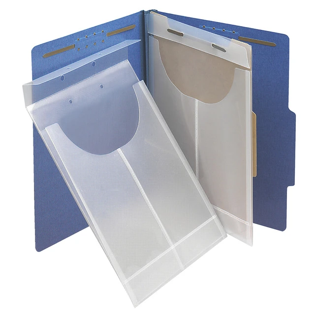 Two-hole punched, poly retention jacket allows you to add documents to fastener folders without punching them. Handy clear pockets are adjustable to fit either letter-size or legal-size folders. The front of each pocket is die-cut for easy access to contents, and the clear stock aids in viewing of the contents. Each pocket expands to 3/4″ to hold more than 100 sheets of paper. Super-durable polypropylene will not transfer toner from important documents. Easy-to-clean material is acid-free, water-resistant and tear-resistant.