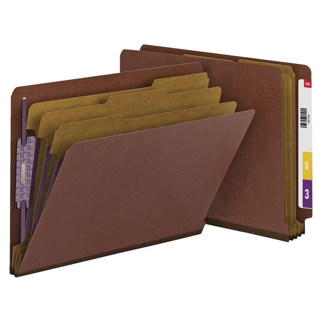 Heavy-duty classification folders feature end tabs and patent-pending, SafeShield Coated Fastener Technology to help prevent paper tears, finger cuts and excessive fastener crinkling. Dividers with tabs and fasteners let you store information under several subdivisions. Fasteners on front and back panels and dividers create separate filing surfaces within one folder. These two 2 inch coated fasteners on the panels are in positions No. 1 and 3. Folder offers a 3 inch expansion and is made of sturdy, 25 point Pressboard stock. The three dividers offer 1 inch SafeShield-coated, twin-prong fasteners and are made of 17 point stock. Folder tab is straight-cut. Divider tab is 3/8 inches high and 1/3 cut.