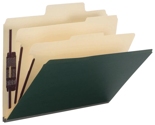 Find critical files fast with SuperTab classification folders. Get nearly double the labeling area of a standard classification folder so you can write larger or use more lines of description. Protect your documents and fingers with the patent-pending, SafeShield Coated Fastener Technology, the ultimate solution to fastener issues including paper tears, finger cuts and excessive fastener crinkling. Two Kraft dividers offer more filing area so you have a total of six filing surfaces. Each letter-size folder has a total of six fasteners to secure your papers. Sturdy, heavyweight folders are made of 25 point Pressboard for extra durability and contain a high recycled content so they are ideal for the eco-friendly office. Sturdy gusset expands 2 inch of letter-size material. 2/5-cut tabs are in the right-of-center position.