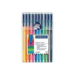 The Staedtler triplus color fiber-tip pens feature an ergonomic triangular shape for easy writing or coloring. They include a stable, pressure-resistant tip, water-based inks that easily wash out of most textiles, and they can be left uncapped for days without drying up. The Staedtler box contains 10 pens in yellow, red, magenta, blue, aqua blue, orange, green, willow green, brown, and black.