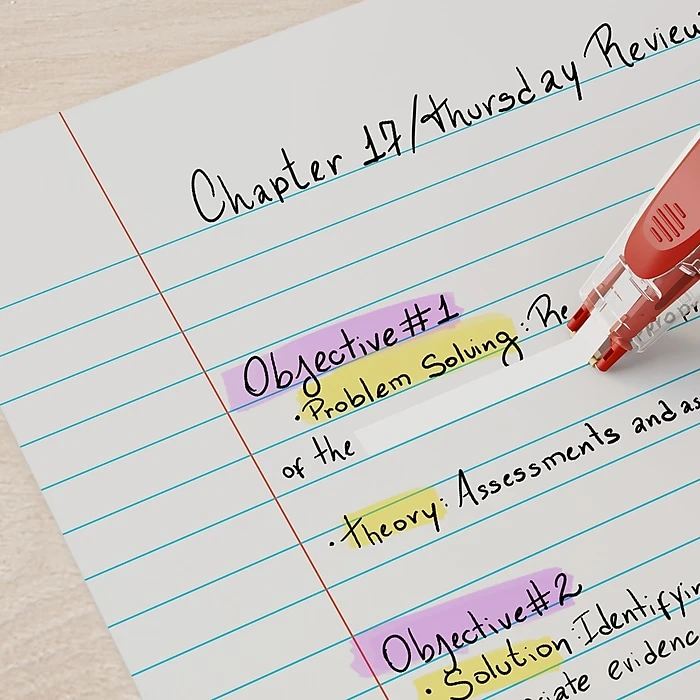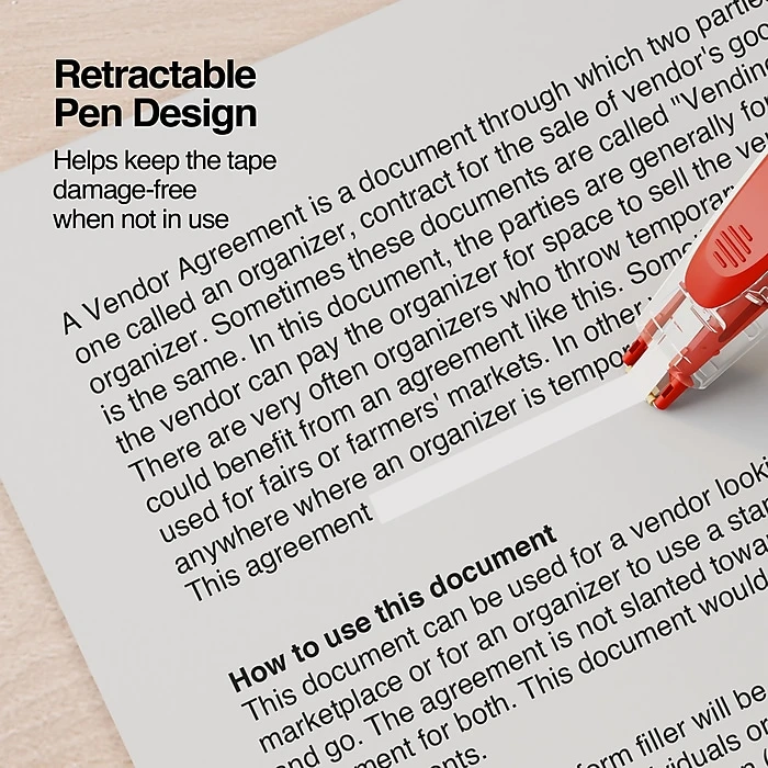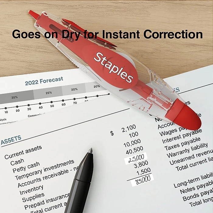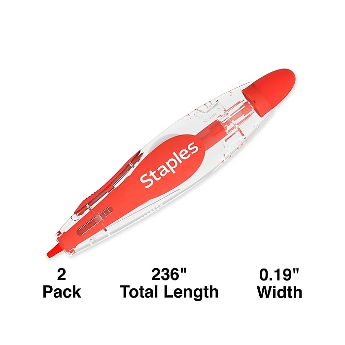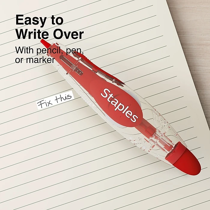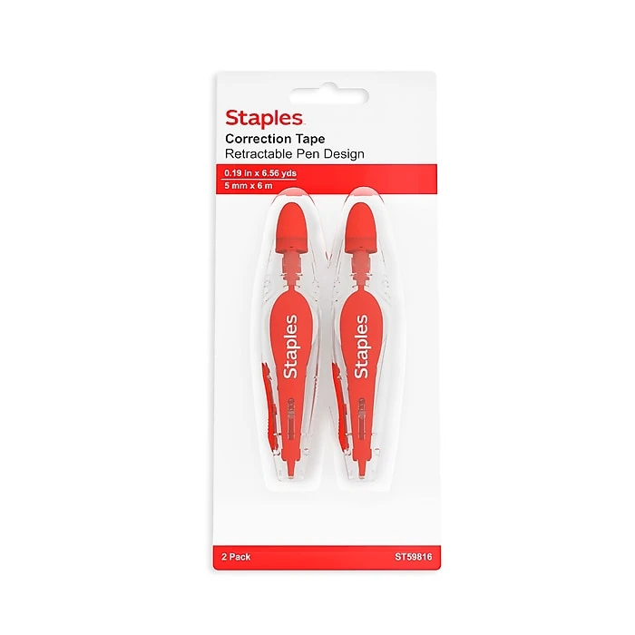 Submit professional-quality documents with these pen-style correction tapes. The retractable design helps keep the tape damage-free when not in use, while the pen-style configuration allows for easy application. With a fast-dry formulation, this essential office supply lets you undo multiple errors cleanly and quickly. These Staples pen-style correction tapes roll out smoothly for hassle-free use and leave no shadows on documents for spotless copy.