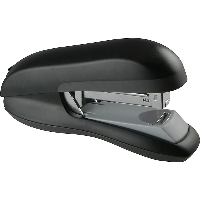 Fasten essential documents securely together with this 30-sheet-capacity black flat-stack half-strip stapler. The contoured shape provides a solid grip, while the smooth edges and black coloring provide a sleek, professional look. This Staples black half-strip stapler folds the staple to ensure flatter stacks, so piles of documents fit nicely on top of one another, while the nonskid base helps hold it steady while in use.