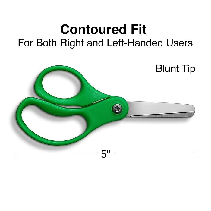 Supply your classroom with the tools for success with these Staples 5-inch blunt-tip kids’ scissors. The blunt tips and shorter blades offer added safety and better control for younger hands, while the ambidextrous handle design accommodate a variety of smaller hands.