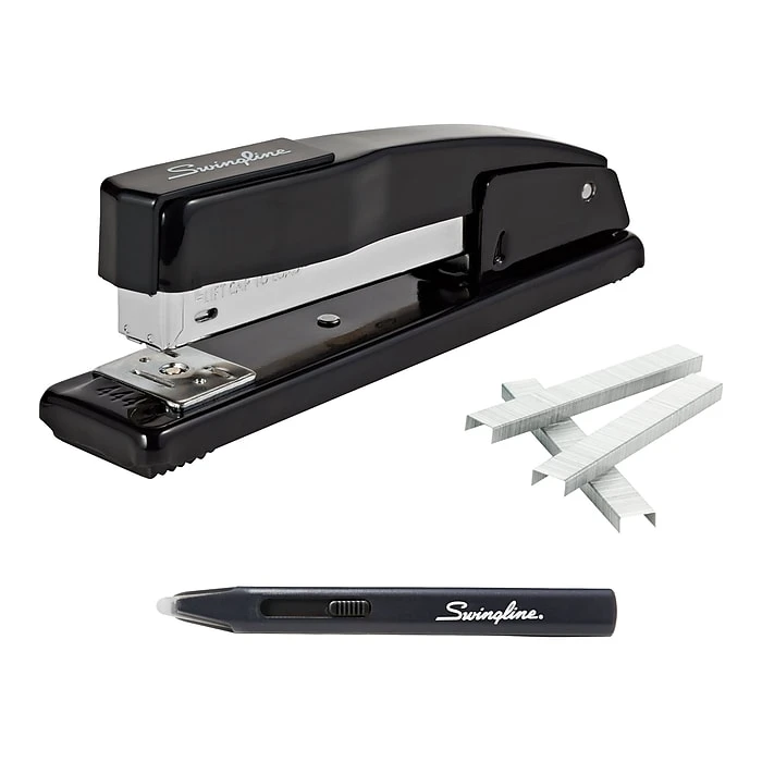 Get reliable, jam-free stapling performance with this full-strip desktop stapler. The low-staple indicator shows when a refill is required to minimize downtime, while sturdy metal construction improves durability for long-lasting operation. Featuring a specialized inner rail, this Swingline Commercial full-strip desktop stapler prevents jamming to increase productivity and can hold 210 staples, which is suitable for busy environments.