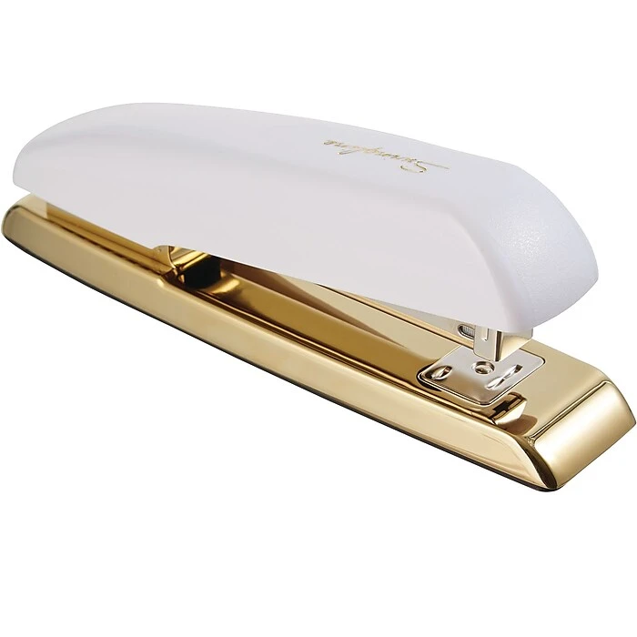 The Swingline® Durable Desk Stapler’s stylish design features a metallic gold base for a chic, professional look. Its contoured body and smooth finish allow for comfortable handling. The stapler can fasten up to 20 sheets of paper at a time. Its anvil reverses for a pinning function to create temporary staples. The stapler also opens to post papers to a soft vertical surface. Built for reliable performance, the stapler features a durable inner metal construction to withstand heavy use. Stylish white/gold design. Limited lifetime warranty included.