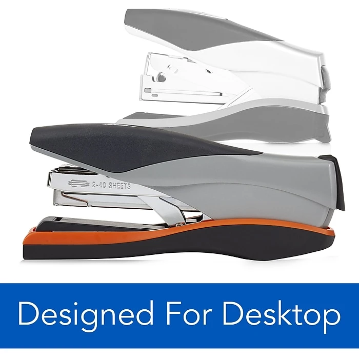 - Desktop stapler with reduced-effort design, ergonomic shape and soft-feel handle makes stapling easier