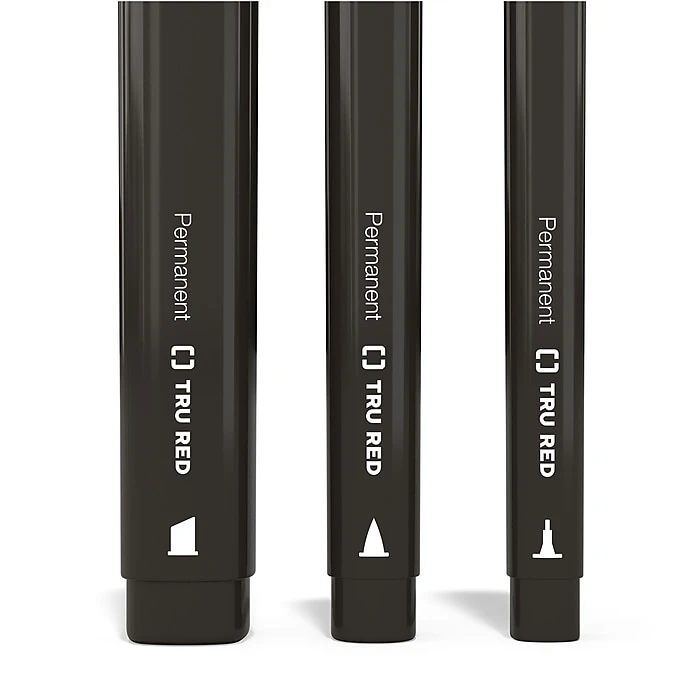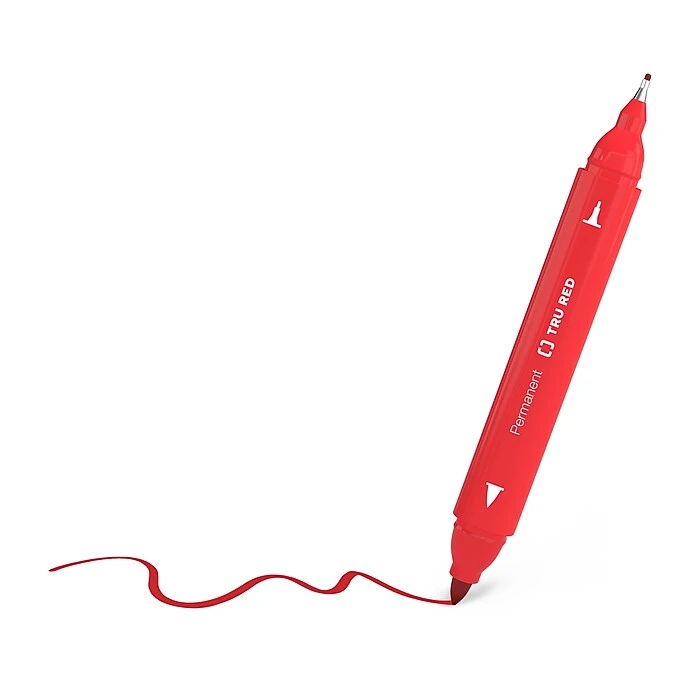 Boost your collection of writing supplies with these permanent markers. The square shape and small profile support a good grip for comfortable use, while the red-colored body and tips are easy to spot in your pen cup. Each of these TRU RED red dual-tip permanent markers has a fine and ultrafine tip for creating a combination of bold lines and crisp details.