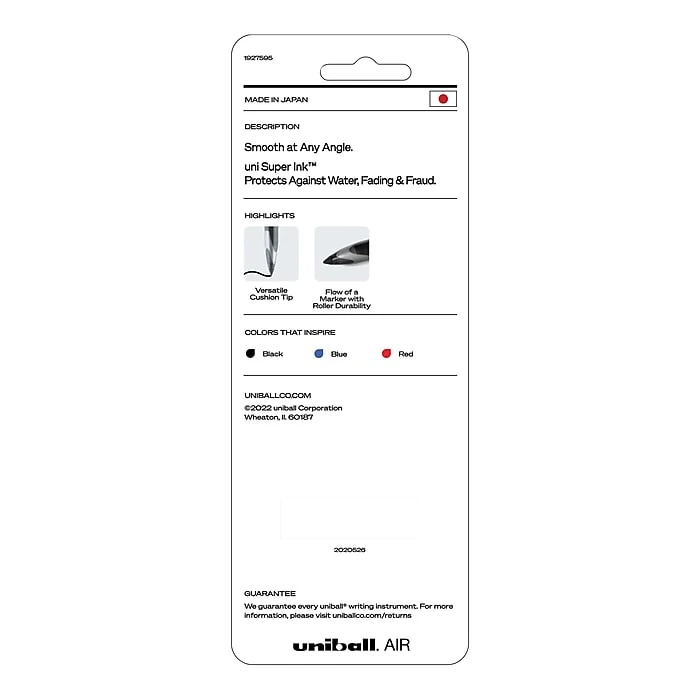 Enjoy a smooth writing experience with AIR Porous Point Rollerball Pens from uniball featuring a 0.7mm medium point. These pens have an innovative sleek tip that writes at any angle while producing crisp, skip-free lines. The porous point rollerball pens adapt to your personal writing grip style, adjusting line widths depending on the pressure of your hand as you write. Combining the fluid ink of a marker with the durability of a rollerball, these pens deliver a smooth writing experience while ensuring your documents are easy to read. Suitable for a variety of writing tasks including journaling, scrapbooking or sketching, these pens are available in assorted colors that glide easily over paper, delivering vibrant marks and lines. uni Super Ink technology ensures the ink adheres strongly to the paper, offering protection from fraud, fading and water. A glass-like plastic clip gives these fine marking pens a stylish look while adding a touch of convenience. Experience effortless writing the moment the pen hits the paper with AIR’s versatile cushion tip technology and fluid, free flowing ink.