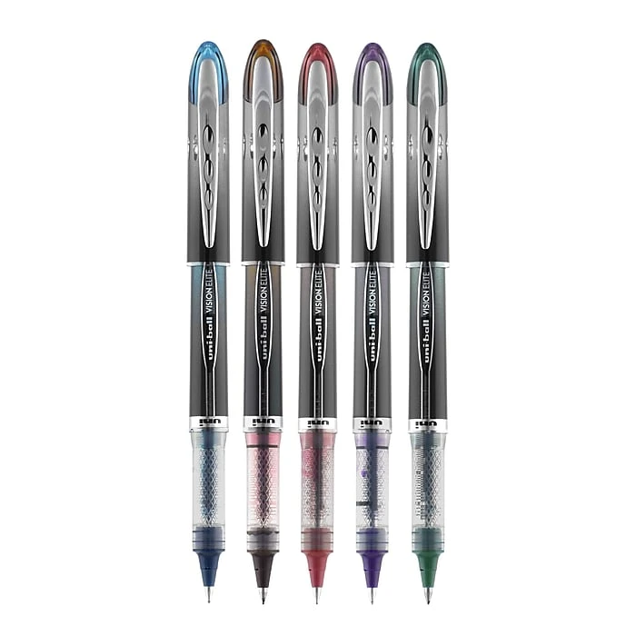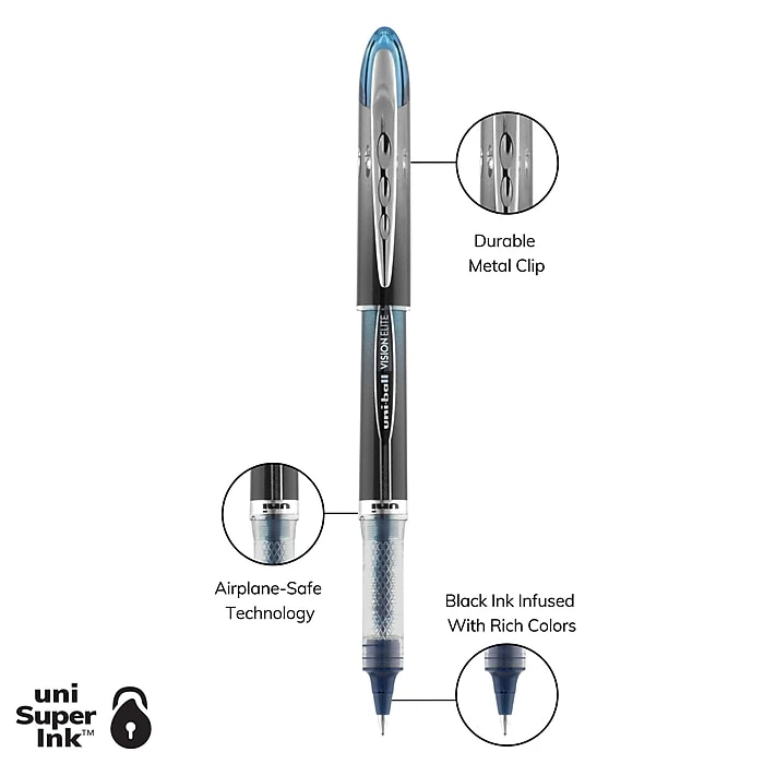 Give your writing a boldy infused flavor with Vision Elite BLX Rollerball Pens from uniball featuring a bend-resistant stainless steel 0.5mm micro tip and tungsten carbide rollerball. Capped roller pens deliver smooth, intense lines with unparalleled definition – useful for note taking, list making, signing checks and legal documents, and even uniquely embellishing creative writing projects. Innovative uni Super Ink technology effectively entraps the gel ink into the paper, producing fraud, fade and water-resistant documents that resist check washing or bleaching. These Vision Elite pens have a special design that withstands cabin pressure variances without leaking, making them useful for travelers. Exclusive Uni-Flow Ink System ensures a consistent, delightfully fluid writing experience, and a translucent window ensures that you don’t run out of ink unexpectedly. These sleek and modern roller pens come in an assortment of black ink infused colors, adding an element of drama to your every day tasks and creative writing projects – no matter the altitude.