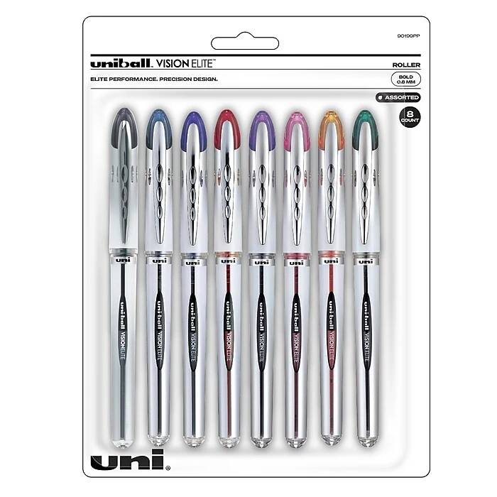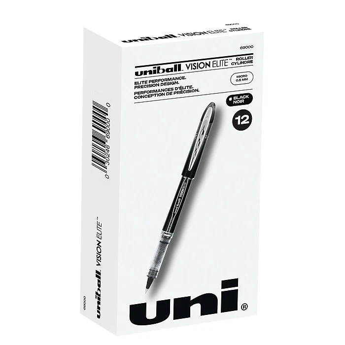 Enjoy a high-performance writing experience with these 0.8mm bold-point black-ink silver-barrel rollerball pens. The barrel is translucent, letting you keep an eye on the ink supply, while the black and white coloring gives the pen a stylish appearance. These uni-ball Vision Elite rollerball pens have a bold point to make whatever you write or draw stand out.